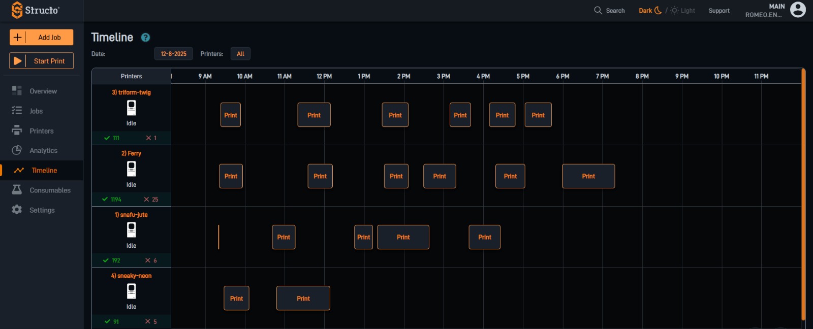 Get a live view of the status of every piece of equipment in your fleet. Maximize uptime by immediately identifying machines that have completed a job, encountered an error, or are low on material. This is essential for enabling "lights out manufacturing" and overnight production.